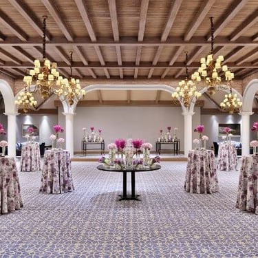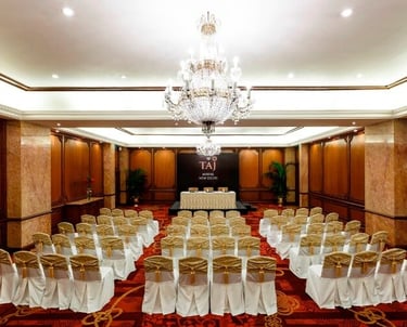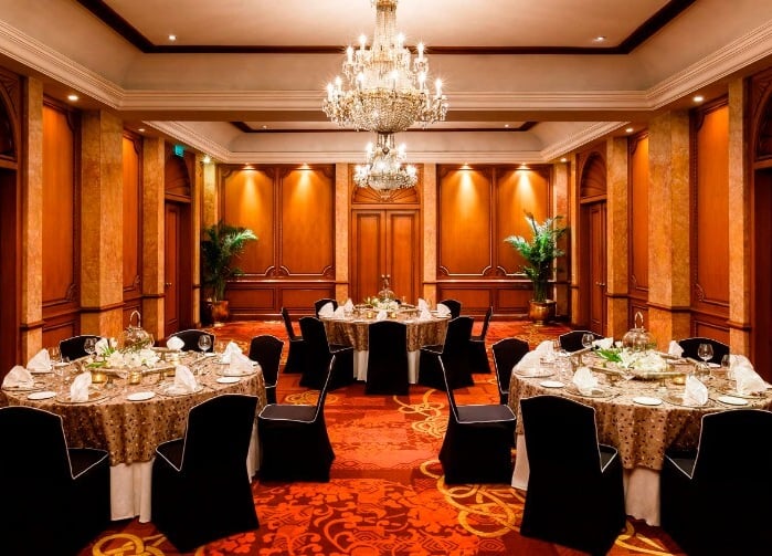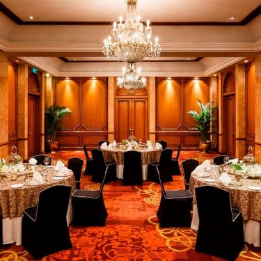 It is a regal, richly-toned venue ideal for intimate events such as small conferences, family gatherings, or corporate retreats. The venue offers the flexibility to expand by connecting to the adjacent halls for larger gatherings. This elegant space is known for its refined atmosphere and exceptional service.