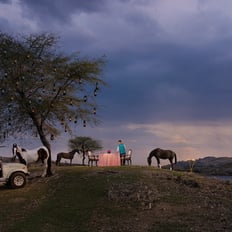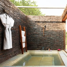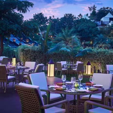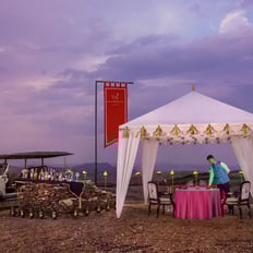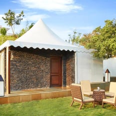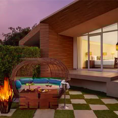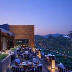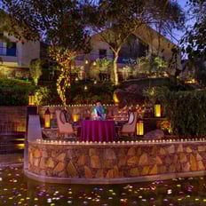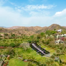 It is a beautifully landscaped space that provides stunning views of the Aravali ranges and the serene, meandering pool. This picturesque setting is ideal for weddings and private celebrations.